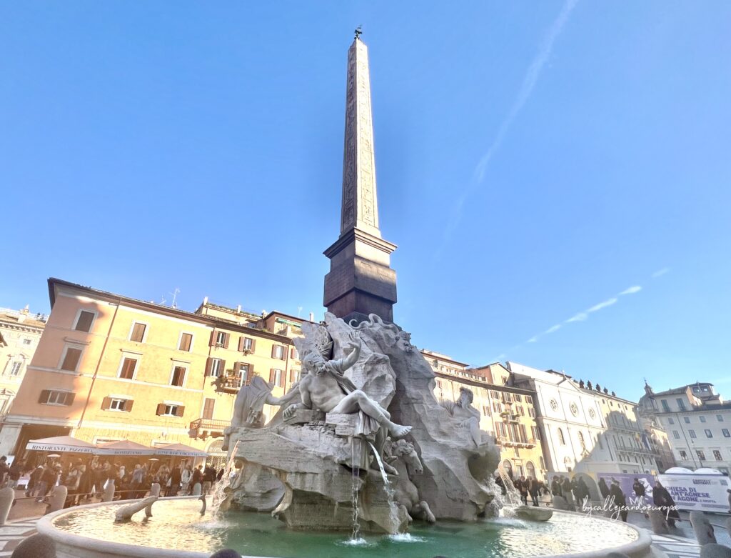 En el centro de la plaza se encuentra la impresionante Fuente de los Cuatro Ríos, diseñada por Bernini en 1651.
