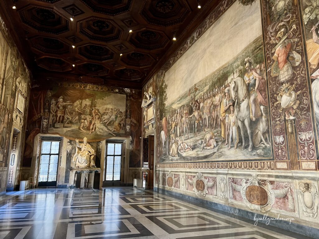 La gran sala de los Apartamentos fue decorada con frescos pintados entre 1595 y 1640 por Giuseppe Cesari, conocido como el Caballero de Arpino (Cavalier d’Arpino), figura clave del manierismo romano. Los frescos ilustran episodios de la historia antigua de Roma narrados por el historiador Tito Livio.