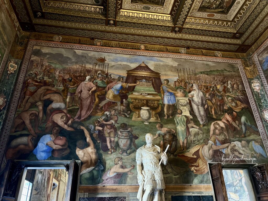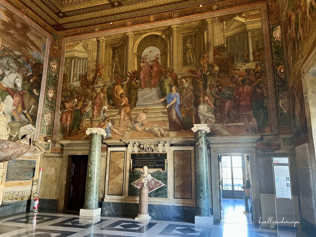 Esta sala parece estar decorada con tapices, pero en realidad son frescos pintados a finales del siglo XVI por Tommaso Laureti. Las escenas muestran la valentía y el sacrificio de los primeros héroes de la República romana.
